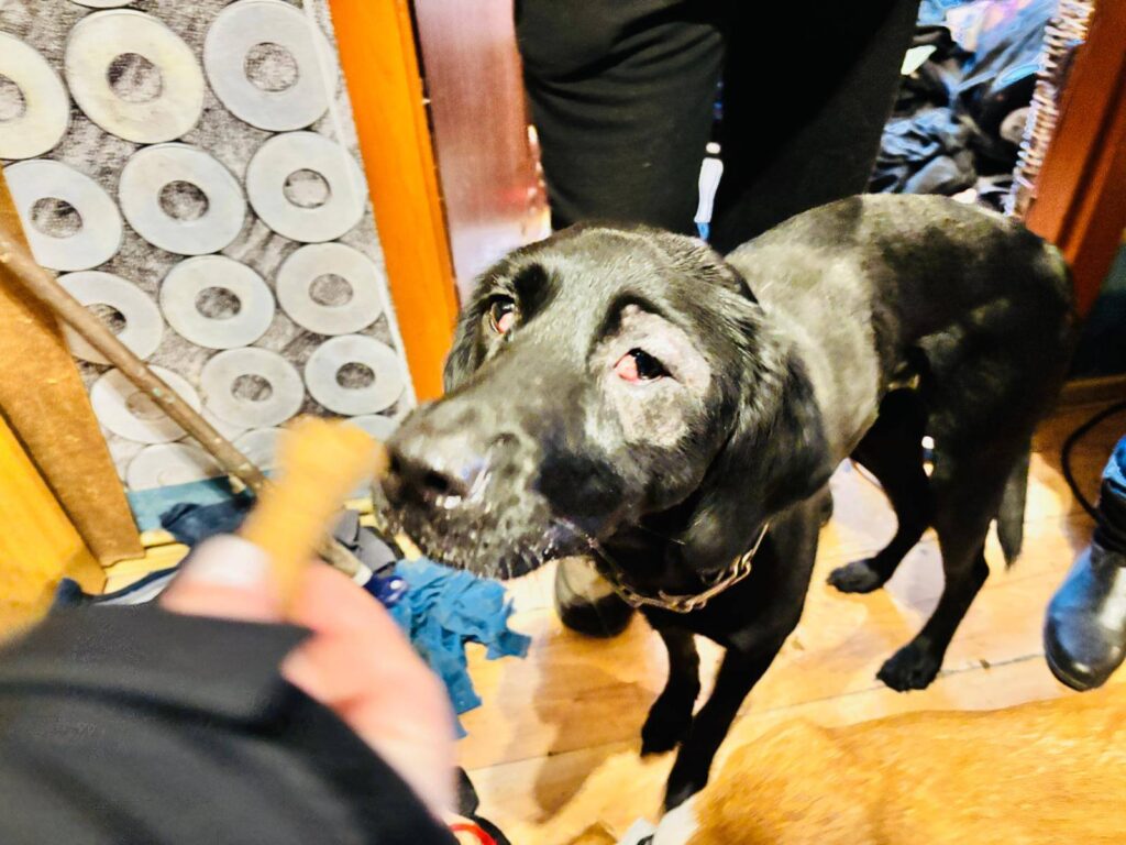 Jeden z psów posiada wyraźne problemy zdrowotne — szczególnie z oczami, które wymagają pilnej diagnostyki i leczenia. Sunia wielkości labradora, czarna z kolczatką na szyi