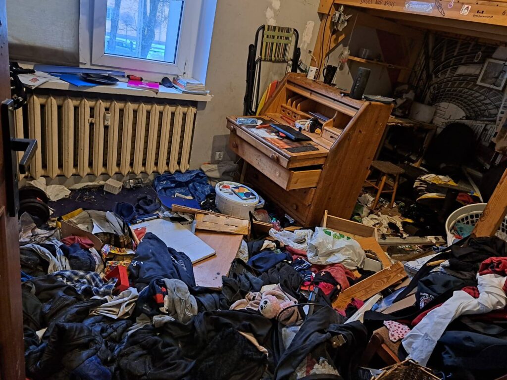 W mieszkaniu panował straszny bałagan, a odchody psów i kotów znajdowały się praktycznie wszędzie. Brud, chaos i intensywny odór świadczyły o długotrwałym zaniedbaniu.