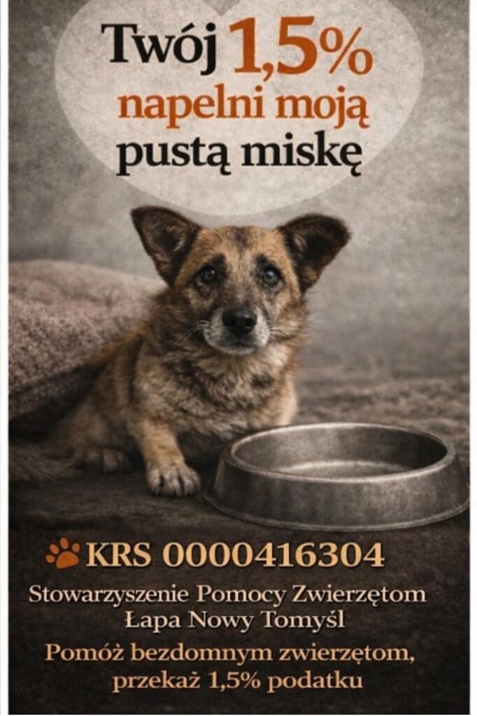 Sezon rozliczeń podatkowych rozpoczęty, zatem prosimy Cię o ten jeden, mały gest, który dla naszych podopiecznych znaczy wszystko Dzięki Twojemu wsparciu możemy pomagać bezdomnym zwierzętom, zapewniać im jedzenie, opiekę weterynaryjną i bezpieczne schronienie, na które zasługują. Ty nic na tym nie tracisz, te pieniądze i tak by trafiły do skarbu państwa – tak więc, to Ty decydujesz, komu pomogą Jak możesz pomóc? To proste Wystarczy, że w odpowiedniej rubryce swojego formularza PIT wpiszesz nasz numer KRS: KRS 0000416304 (nie musisz podawać żadnych dodatkowych celów szczegółowych) Twój 1,5% zamienia się w realną pomoc – pełną miskę, ciepłe posłanie i szansę na nowy, kochający dom dla zwierzaków, które same o to nie poproszą Pokażmy razem, że los bezdomniaków z Nowego Tomyśla i