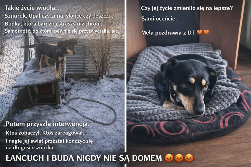 Takie życie wiodła… Sznurek. Upał czy zima, słonce czy deszcz… Budka, która bardziej straszy niż chroni. Samotność, do której pewnie się przyzwyczaiła, ale… Potem przyszła interwencja… Ktoś zobaczył… Ktoś zgłosił… Ktoś zareagował… I nagle jej świat przestał kończyć się na długości sznurka…. Czy jej życie zmieniło się na lepsze? Sami oceńcie. Mela pozdrawia z DT ŁAŃCUCH I BUDA NIGDY NIE JEST DOMEM
